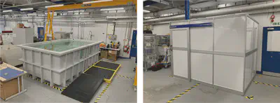 Testing & calibration tank 4.3x2.5x1.4m with side viewing ports 1 tonne gantry crane